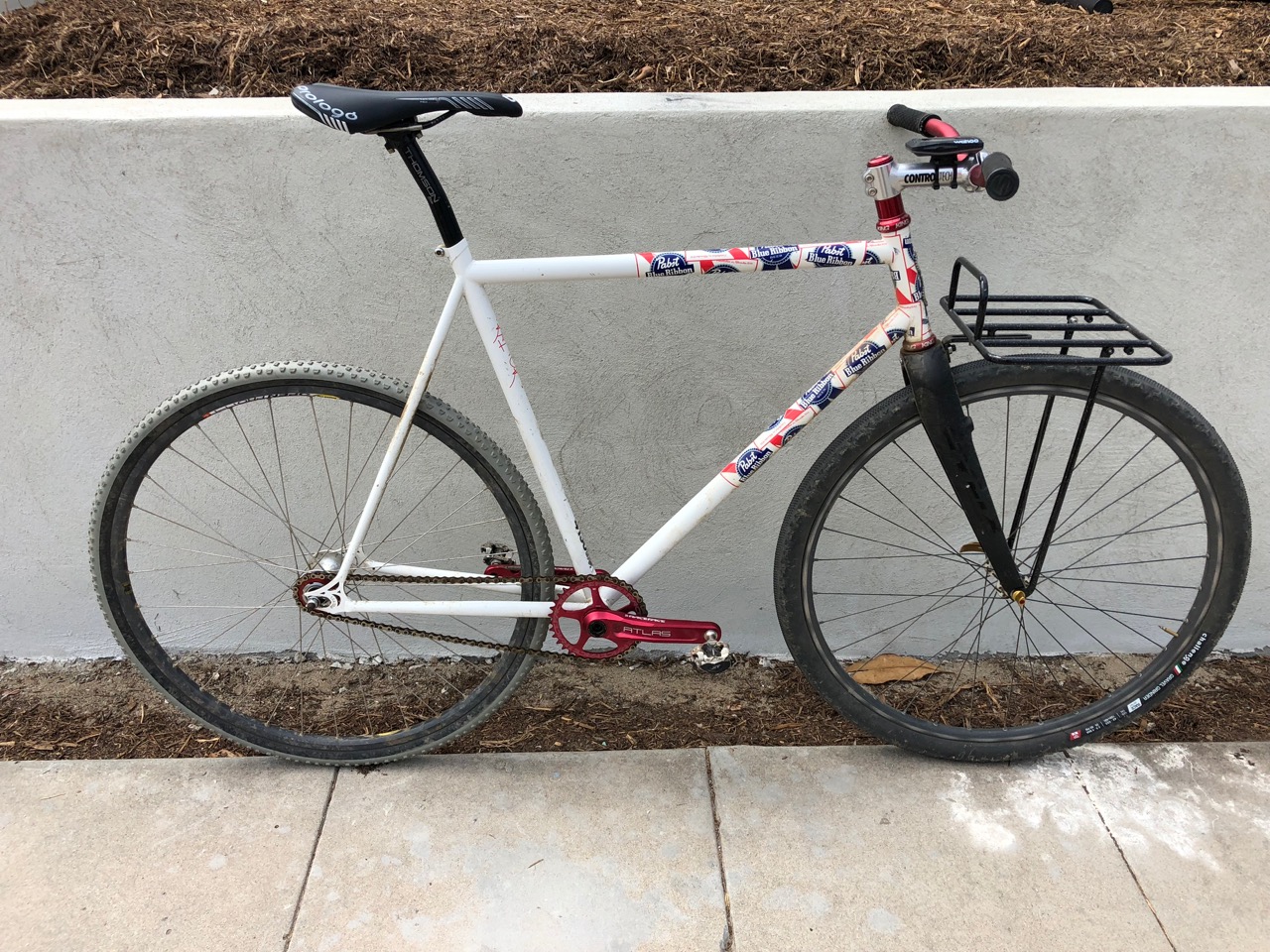 Here's the bike all finished. For tracklocross, a ~2.35 ratio is pretty ideal, assuming a fairly flat course. This bike has a 36t chainring and a 15t cog, which yields a 2.4 ratio. A note on the chainring: this is RaceFace's very cool narrow-wide direct-mount type, which means you're very unlikely to drop a chain and also that you can only get chainrings in even tooth increments. These things seem to work great with either a 3/32" chain or a 1/8" chain. Some purists might not like it, but I'm running a 1/8" and it works like a champ.
